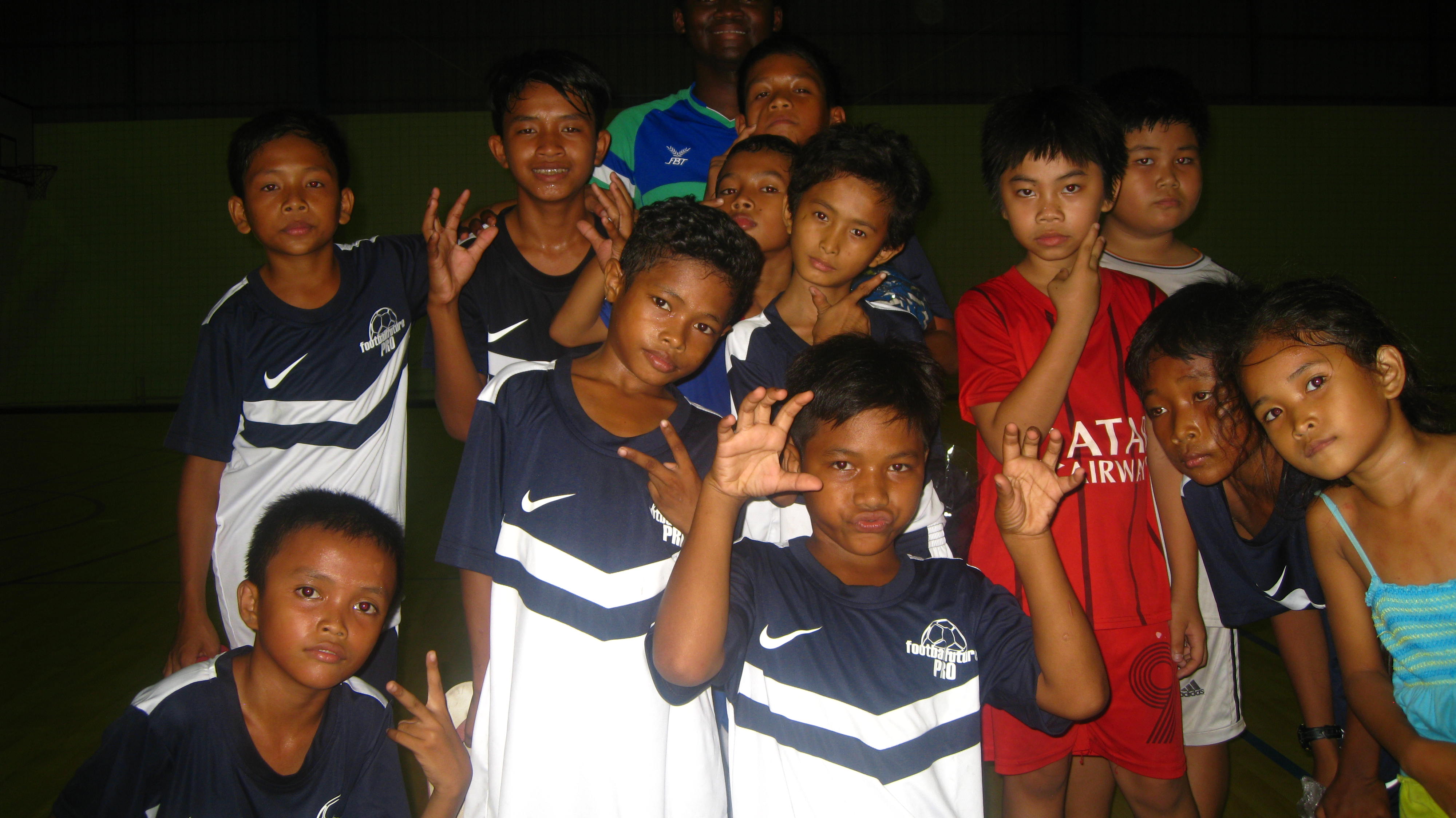 FFPCA free skills aquisition football day - Once weekly FFPCA offers a free football training session where street kids and poorer kids from around the venue's neighborhood can come and enjoy themselves in a safe and structured learning environment. Here we have coaches Sopheak and Jean with 25 enthusiastic youngsters in bare feet and all just after the session who come back each week to improve their skills and compete against each other.